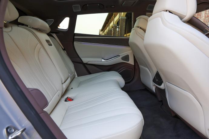 A hátul is királyi: ugyanazokkal a funkciókkal ellátott ülések, melyeket a lábtámaszok még tovább emelnek. A hossz pedig 5,18 méter, így a utasoknak bőven jut hely. A kényelmet az oldalanként elhelyezett kijelzők és a 17,3 coll központi panel, valamint két 13,2 coll kijelző biztosítják. Emellett egy 50 hüvelykes, kiterjesztett valóságon alapuló heads-up kijelző segíti a vezetőt.